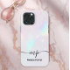 Below the iridescent shimmer, a delicate monogram (e.g., "mp") and your full name (e.g., "Melissa Parker") are displayed in a clean, modern script font. This case is the perfect accessory for anyone who loves Y2K nostalgia, modern glam, and personalised style.