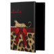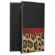 Stylish iPad Air case, with built in stand and graphics of a spotted brown and black coloured jaguar fur pattern, on the bottom, with a solid black on the top, of the case. Graphics of a red satin looking ribbon runs across the middle and has a pretty red bow, on the right side. Graphics of a wild spotted big cat appears to lay across the top of the ribbon. Personalise the red text. Makes an excellent gift idea.