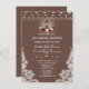 Unique card design featuring string lights, old lantern with marsala flowers bouquet on a burlap with lace corners background. Use Customise tool to add your info. See, also, my Vintage Lace Collection.