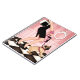 Gorgeous illustration of an elegant lady with shopping bags and pug puppy on hot pink leash, with chic check tile floor in the background, painted by artist Maryline Cazenave.