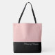 This lovely fashion forward tote bag shows the word "Maid of Honour" in white text colour over black with the upper tote bag in custom Dusty Rose Pink. Has plenty of room for personalised text. Graphics and text are on both sides of this tote bag. Black handle. Customise further or buy as shown.