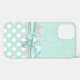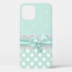Lovely mint green and white iPhone 12 case, with a mint green on green damask pattern, on top, and a mint green with white polka dot pattern, on the bottom. Graphics of a white lace band and a mint green ribbon and bow runs across the middle between the two backgrounds. Customise to add your own text. Great way to look stylish and protect your electronic device at the same time.