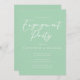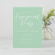 This soft mint green engagement party invitation features chic white script for a sweet spring outdoor event. Simple typography on a tranquil solid pastel green invite for a garden venue.