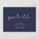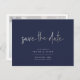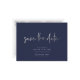 Chic and modern signature script in faux silver Save the Date postcards, DIY background in navy blue. Copyright © 2016-2019 Bombino Designs.