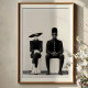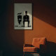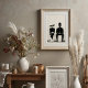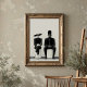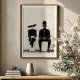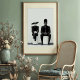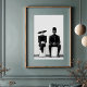 Step into a world of timeless sophistication with this striking black and white art print. Featuring a mysterious and impeccably dressed fashion duo, this piece exudes an air of enigmatic elegance. The woman, adorned in a dramatic wide-brimmed hat and oversized sunglasses, commands attention with her tailored black suit and poised demeanour. Beside her, a man in a unique tall, structured hat and equally stylish shades mirrors her chic presence, his tailored black suit accented with distinctive white buttons. Seated on classic white pedestals against a pristine light backdrop, with a subtle textured foreground of grass, the composition is a masterful study in minimalism and high contrast. This art print is perfect for adding a touch of contemporary chic and a bold fashion statement to any living room, bedroom, office, or gallery wall. An ideal choice for art enthusiasts, fashion connoisseurs, and those who appreciate modern, sophisticated aesthetics.