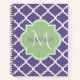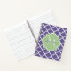 A stylish dusty purple quatrefoil patterned standard size notebook with a scalloped badge in soft green that you can personalise by adding your name and monogrammed initial to. This is part of the Ultra Violet and Nile Green Spring Collection.