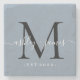 Chic, modern black monogrammed stone coaster with your names and year established in white elegant hand lettered script calligraphy with a black monogram on a dusty blue background. Simply add your names, monogram and year established beneath. Stylish design and perfect luxury gift for the newlywed couple. If you need any help or matching products please contact us at happydolphinstudio@outlook.com. We're happy to help you make your wedding the most beautiful day! Exclusively designed for you by Happy Dolphin Studio.