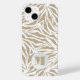A stylish cell phone case features your monogram initial on a beige zebra stripes animal print pattern. CHOOSE YOUR MODEL AND MAKER WHEN ORDERING! Create for yourself or give as a gift. MATCHING drawstring bag, luggage tag and more items in our travel collection.