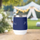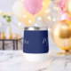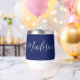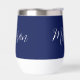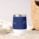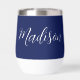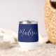 A chic navy blue personalised monogram wine tumbler for a girl or guy who loves simple, handwritten gifts. Beautiful white cursive script down the side spelling out your name in modern typography.