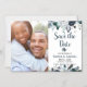 Chic bohemian navy blue and white watercolor botanical rose floral, wedding Save the Date Photo Postcard.