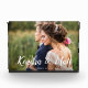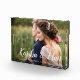 Elegant wedding photo block features your favourite horizontal or landscape orientated wedding photo. Your names appear in chic white handwritten script lettering as a text overlay with your wedding date beneath.