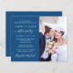 Chic and budget-friendly classic blue elopement / private wedding announcement and reception invitation featuring your photo and "Happily Ever After Party" in a mix of modern white typography and a stylish white script with swashes. Personalise your party or reception details and add your names in a signature-like script. On the back, input the URL address of your wedding website to generate a QR code that your guests can scan to RSVP online.