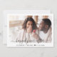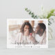 Modern save the date announcement featuring your photo overlayed with "happily ever after" in a stylish script with swashes and your names and wedding date joined together with a heart. On the reverse side, customise your announcement in elegant typography and and input your wedding website address to create a QR code for your guests to scan for wedding updates and details.