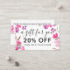 Floral watercolor gift discount card and a modern typography, with hand painted pink flowers with green and brown leaf and branches in a botanical bouquet arrangement. An elegant script calligraphy,