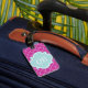 Elegant pink and white moroccan lattice trellis luggage tag with personalised monogram. Stylish monogrammed gift idea for travelling men and women. Cute modern travel accessory for chic bags and suitcases. Customisable background colour. Add name initials.