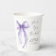 Elegant paper cups for your bridal shower featuring a beautiful watercolor of a purple coquette bow, "She's tying the knot" in a chic calligraphy script, and the bride's name and shower date in simple modern lettering.