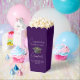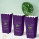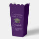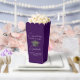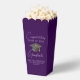 These modern purple custom senior graduation party popcorn favor boxes features your high school or college name for the class of 2026. Customize with a memorable quote under the elegant handwritten script and grey grad cap for great personalized graduate party favors.