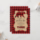 Joyful Birthday/Lumberjack Party invitation featuring red plaid bear silhouette, red plaid THREE for year, a beautiful rustic old paper shape with dotted frame for info. Use Customize tool to add your info.