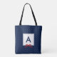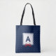 Chic monogram tote bag featuring a blue bordered square with a red ribbon against a blue and white polka dot pattern. Great as gifts for family and friends or for yourself.