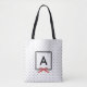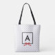 Chic monogram tote bag featuring a black bordered square with a red ribbon against a black and white polka dot pattern. Great as gifts for family and friends or for yourself.