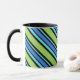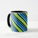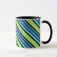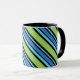A chic Ringer Mug with a deckchair-striped Blue Moons pattern in Turquoise, Neon Green, Dazzling Blue and Black. Part of the Posh & Painterly 'Blue Moons' collection.