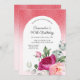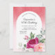 Elegant birthday invitation features a vibrant watercolor rose flower with leafy greenery on a arch shape background with red glitter. Ideal invitation for woman and girl's birthday themed party. Matching Items in our shop for a complete party theme.