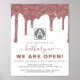 Chic Rose Gold Sparkle Glitter Drips Business Opening Sign Poster with our trendy faux glitter drips in blush pink/rose gold and your name, business name, or logo. Perfect for advertising your opening, reopening, or just for showing off your luxury aesthetic. You're dripping in luxury, so your gear should be, too! Please contact us at cedarandstring@gmail.com if you need assistance with the design or matching products.