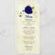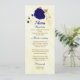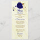 beautiful royal blue flowers and gold leaves elegant wedding menu.