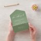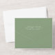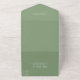This simple solid sage green wedding all in one invitation comes with a detachable RSVP card and features elegant white typography for an outdoor ceremony in a nature setting. Minimalist script on a peaceful light green invite for a rustic venue outside near a forest of trees.