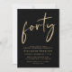 Chic black invitation for your 40th birthday party featuring "forty" in a stylish gold script, your name in elegant gold serif typography, and the party details in simple, modern gold lettering.