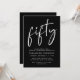 Chic black invitation for your 50th birthday party featuring "fifty" in a stylish white script, your name in elegant white serif typography, and the party details in simple, modern white lettering.