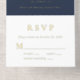 Elegant dark navy blue 70th birthday party all in one invitation featuring "seventy" in a chic script, your name in elegant serif typography, the party details in simple, modern lettering, and a tear-away RSVP response card, all rendered in your choice of genuine gold, silver or rose gold foil.