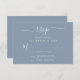 Chic dusty blue wedding RSVP card featuring "rsvp" in a stylish white script with swashes, simple and elegant white typography and your names joined together by a heart on the back.