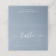 Chic dusty blue wedding table number place cards with "table" in an elegant white script with swashes and blank lines for you to fill in the table numbers and guests' names. On the back, add your first names joined by a heart and your reception date.