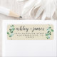 Chic, modern and simple wedding return address label with your names in off-black elegant hand written script calligraphy with a stylish touch of green eucalyptus foliage on an antique white background. Simply add your names and address. Exclusively designed for you by Happy Dolphin Studio. If you need any help or matching products, please contact us at happydolphinstudio@outlook.com. We're happy to help you make your wedding the most beautiful day!
