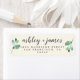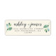Chic, modern and simple wedding return address label with your names in off-black elegant handwritten script calligraphy with a stylish touch of green foliage on an offwhite background. Simply add your names and address. Exclusively designed for you by Happy Dolphin Studio. If you need any help or matching products, please contact us at happydolphinstudio@outlook.com. We're happy to help you make your wedding the most beautiful day!