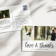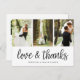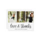 A modern photo thank you postcard designed to accommodate three of your favourite wedding photos aligned side by side. "Love and thanks" appears along the bottom in black handwritten style script. Personalise with your names and/or wedding date beneath.