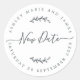 Chic, modern and simple new date postponed wedding classic round sticker features the text Ne Date in off-black elegant handwritten script calligraphy on a white background with a stylish touch of rustic foliage. Simply add your names and new wedding date. Exclusively designed for you by Happy Dolphin Studio. If you need any help or matching products please contact us at happydolphinstudio@outlook.com. We're happy to help you make your wedding the most beautiful day!