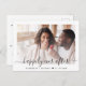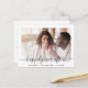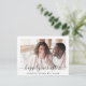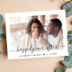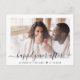 Modern save the date announcement postcard featuring your photo overlayed with "happily ever after" in a chic script with swashes and your names and wedding date joined together with a heart. On the reverse side, customise your save the date message and add your names in a signature-like script.