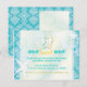 Sweet sea horse couple, starfish pair and ocean waves + glittering damask pattern in light yellow & teal colours illustrated on custom New Home Announcements | Housewarming Party Invitations. Especially great for your new beach house party, and you can easily personalise the sample text with your own wording! Feel free to change the colours, fonts & sizes of the text as well.