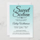 A chic sea shell blue ombre design Sweet 16 birthday invitation. The bright blue fades onto a white background. The text "Sweet Sixteen" in black is set in modern script. The colour pink lemonade is used for this design. Elegant 16th birthday party invitation for a glamourous Sweet Sixteen, perfect for her, the fashionista who loves modern pattern, luxury and glam with a summer beach theme. Exclusively designed for you by Happy Dolphin Studio.