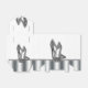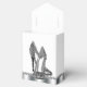 Beautiful black and silver glitter high heel shoe party favour boxes. These elegant black and silver glitter high heel shoe favour boxes can be customised with text and you can change the background colour and bow colour.