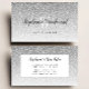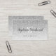 This elegant modern business card features a background image of silver ombre faux glitter. Personalise it with your monogram initial in white serif font, your name in charcoal grey calligraphy script, and your service or profession below in grey sans serif font. Add your business details on the back in grey text on a white rectangle framed by the same silver ombre glitter design.