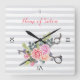 Surround customers with your personal brand of chic with this stylish floral and stripes hair salon clock featuring a pair of silver hair salon scissors enveloped in a bouquet of feminine pink and peach roses against a soft grey and white horizontal painted stripes. Personalise by adding the name of your salon or hair boutique. Flat printed image, NOT metallic.