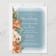 Gorgeous Watercolor florals featuring burnt orange and cream flowers arranged in a modern boho chic bouquet including daisy, dahlia peony and berries along dark green botanicals for contrast and balance. A smokey blue watercolor wash provides a modern boho and dreamy background which enhances the white textured double frame and typography.
