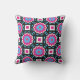 Vibrant outdoor pillow design featuring a seamless pattern composed of geometric shapes in pink, blue, black and white.