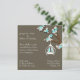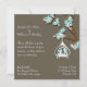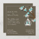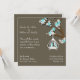 Stylish custom square wedding invitation done in taupe, with white text ready to personalise for your wedding day. Elegant graphic artwork of a blooming tree branch with a pair of aquamarine coloured love birds hanging down, in a white cage.