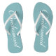 Chic teal blue bridesmaid beach wedding flip flops. Personalizable elegant flipflops for bride's entourage / team bride. Make your own personalised wedge sandals for bride, brides maid, maid of honour, flower girl, mother of the bride, mother of the groom, guest etc. Cute summer slippers for nautical or beach theme marriage near the seaside. Also nice as coastal wedding party favour for guests or as travel present for newlyweds going on honeymoon holiday destination. Create a set for him and her. Stylish script typography template design. Create your own pair of classy flipflops for groomsmen and guests. Fun souvenir slippers set for summer in july and august. White, black, pink or blue strap colour. Change quantity to get a cheap discount price.
