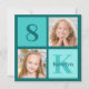 Chic 2 photo teal birthday party invitation for a trendy girl. Celebrate your child's birthday with two beautiful photographs of them on this add your own photograph invite with turquoise squares. Add your kid's name and age.