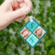 Chic 2 photo square keychain for a trendy girl's birthday. Celebrate your child's birthday with two beautiful photographs of them on this add your own photograph gift with turquoise squares. Add your kid's name and age.